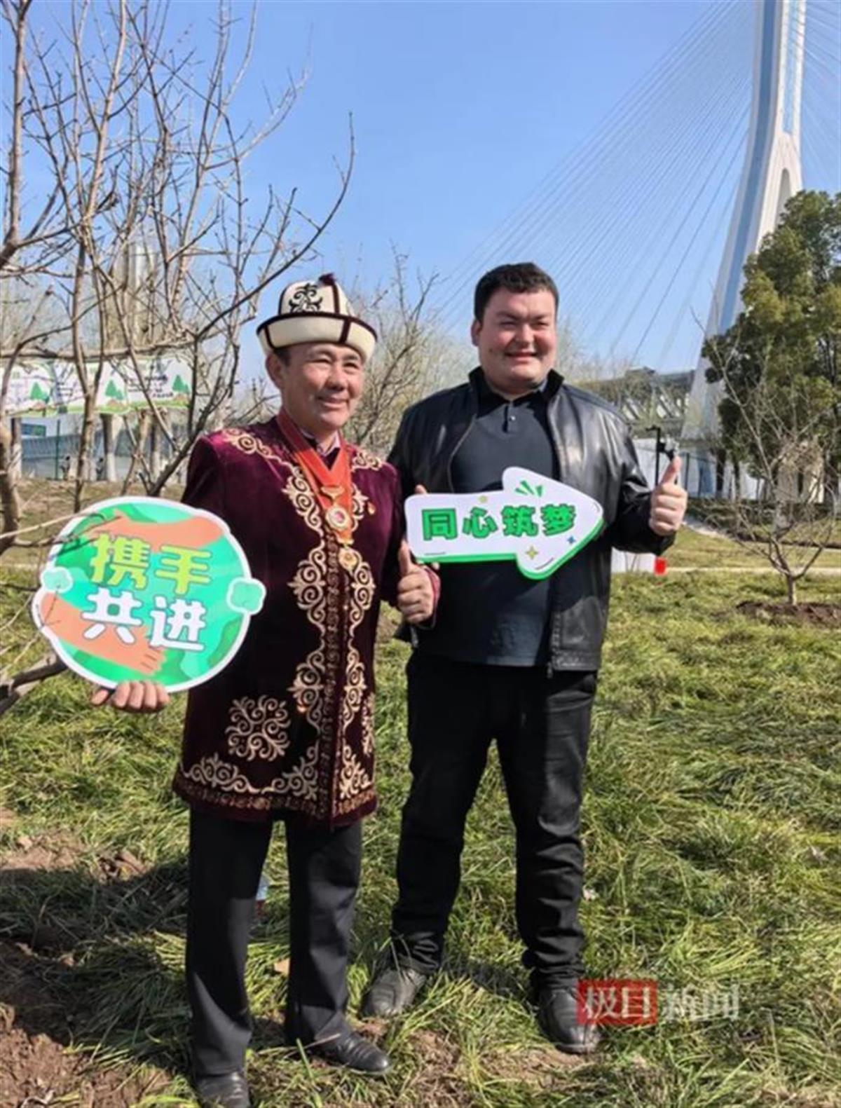 3月18日,曾因匡助5名武汉搭客在新疆脱困的“党徽大叔”阿布皆加帕尔·猛德和在湖北监利2天连救3名落水者的玉苏普江来到武汉,在青山江滩共植石榴树“齐心林”。(据3月18日极目新闻报说念)