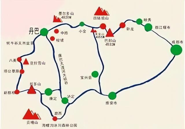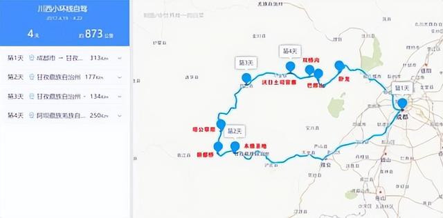 路子:成都 - 都江堰 - 四密斯山镇 - 丹巴 - 不雅音桥镇 - 色达 - 甘孜县 - 新龙县 - 理塘县 - 稻城亚丁 - 香格里拉镇 - 新都桥 - 康定 - 磨西古镇 - 泸定 - 成都