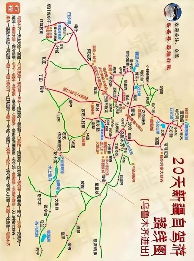 路子:乌鲁木都 - 天山天池 - 富蕴 - 可可托海 - 布尔津 - 禾木 - 喀纳斯 - 白哈巴 - 乌尔禾妖怪城 - 赛里木湖 - 霍尔果斯 - 伊宁 - 那拉提草原 - 巴音布鲁克 - 库车 - 阿克苏 - 喀什 - 塔什库尔干 - 和田 - 库尔勒 - 乌鲁木都