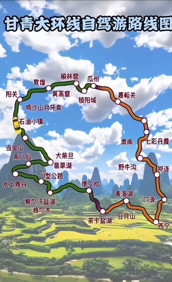 路子:西宁 - 塔尔寺 - 青海湖 - 茶卡盐湖 - 大柴旦 - 翡翠湖 - 阿克塞 - 敦煌 - 莫高窟 - 鸣沙山眉月泉 - 嘉峪关 - 张掖七彩丹霞 - 祁连大草原 - 门源油菜花 - 西宁