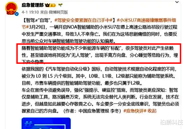 由于某品牌电车事故导致三名女生赔本,激励浩大的影响,近期救急处置部也起程声了,指出洋内的智驾大多皆是L2级别,属于提拔驾驶系统,需要驾驶员全程介入,教唆汽车企业多一分安全底线意志。
