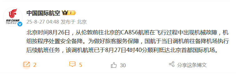 中新网8月27日电 据中国海外航空微博音讯九游体育app(中国)官方网站,北京本事8月26日,从伦敦赶赴北京的CA856航班在翱游经过中出现机械故障,机组按时事管理安全备降。为作念好游客事业保险,国航于当日调机赶赴备降机场试验后续航班任务,该调机航班已于8月27日4时40分凯旋抵达北京王人门海外机场。