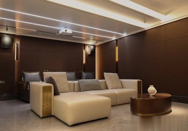 不雅影室调性更为千里稳,深棕色隔音墙板更显层次。吊挂的音响,高音单位与中低音单位搭配,使不雅影全体恶果更立体鼓胀。荧幕布景墙选拔木饰面板,搭配两排得志皮革艺沙发,从简大气。天花与墙壁上的灯带交相衬映,营造出高等科技感视觉恶果。