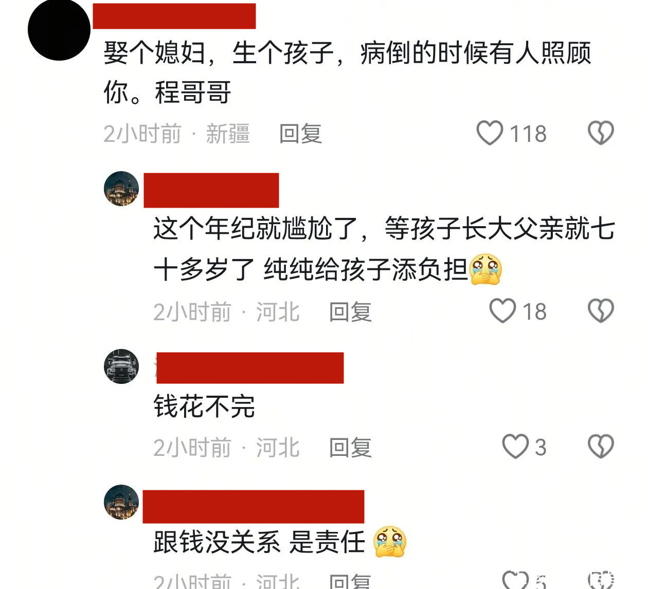 值得一提的是,有难得的网友防护到,程成入院莫得东说念主陪护,纷繁提倡他出院后要把婚配大事提上日程,但愿他有个伴。