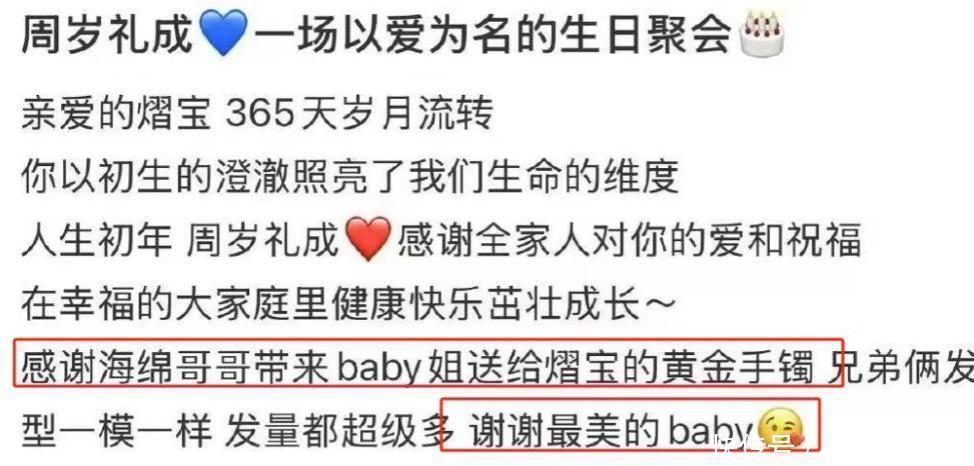 小海绵手里的金镯子尽头显眼——那是杨颖提前准备、让女儿代为送出的周岁贺礼。