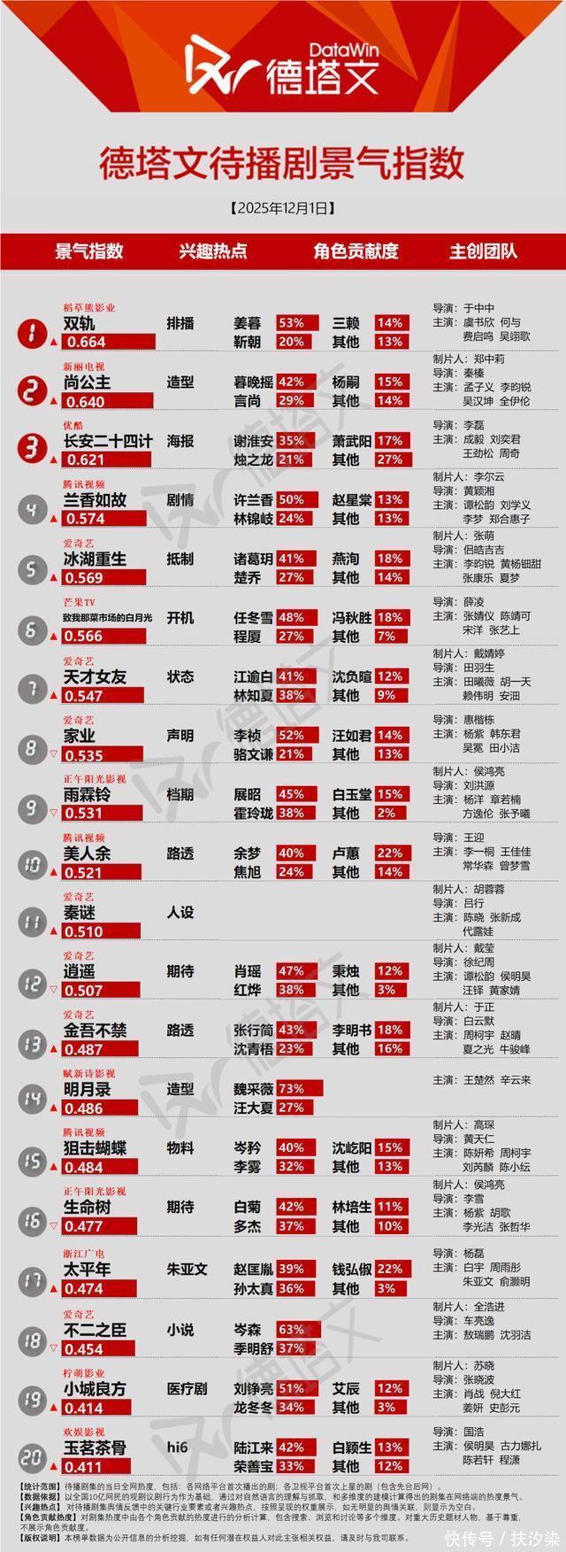 TOP20名次 双轨(姜暮53%靳朝20%)尚公主(暮晚摇42%言尚29%)长安二十四计(谢淮安35%烛之龙21%)兰香已经冰湖更生致我那菜市集的白蟾光天才女友家业雨霖铃好意思东说念主余秦谜浪漫金吾不禁明月录狙击蝴蝶生命树太平年不二之臣小城良方玉茗茶骨 德塔文当天解读 《致我那菜市集的白蟾光》至当天官宣开机,主演张婧仪的热度带动剧集期待值。该剧改编自璞玉与月亮的同名演义,展现逾越十余年的个东说念主繁荣与成长,评释了一个对于“暗恋”与“逆袭”的双向救赎故事。其亮点是聚焦底层女性硬核逆袭,以反套路叙事激励全网期待。鉴于此,部分原著党也敕令顺应缩减心情戏占比九游体育娱乐网,转而深挖女主职场线的厚度。《致我那菜市集的白蟾光》由薛凌合手导,张婧仪、陈靖可主演,芒果TV、湖南卫视、芒果超媒、芒果影视出品。 1、德塔文剧集景气指数计较剧集的全网计划度、网友互动量、媒体曝光率,收集口碑等因素,辛苦于反应最真是的剧集热度,是行业更先进的剧集热度方向; 2、变装孝敬度:剧蚁集九游体育娱乐网,各变装孝敬的计划热度对该剧总变装热度孝敬占比。 3、榜单披露主出品公司和主播放平台,以及待播剧的收集舆情焦点。 4、数据秘密初次上星的电视剧和初次播出的网剧。 5、数据源为公开信息的分析挖掘,如有任何潜在权利东说念主对此观点干系权利,请实时与我司干系。