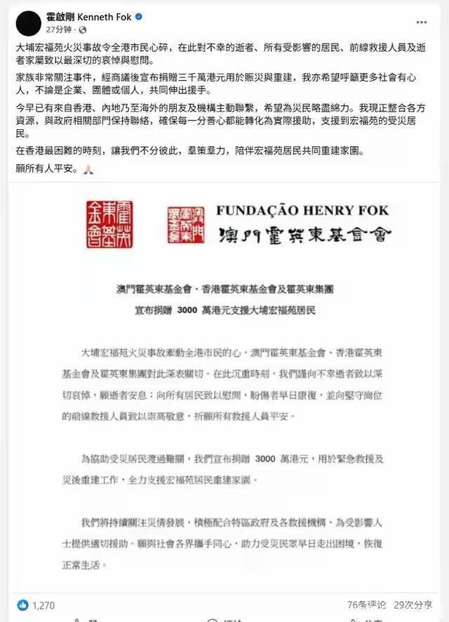 既对遭难者抒发真切悲痛,也明确晓谕澳门霍英东基金会、香港霍英东基金会及霍英东集团共同捐赠3000万港元,挑升用于失火的首要拯救和灾后重建。