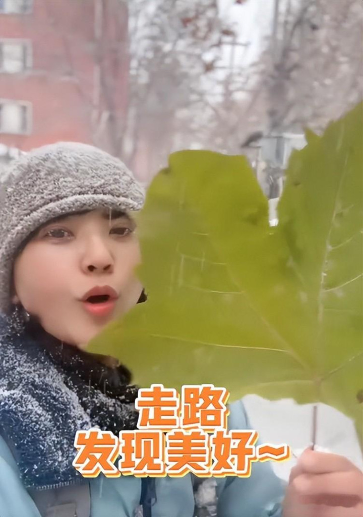 视频后半段,换上新鞋的方琼哼着歌陆续观赏雪景,还捡起沾雪的叶子对着镜头摇晃。