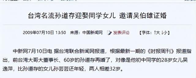 新娘是他初中同学的女儿吴逸萍,其时只好28岁,比他的女儿孙芸芸还小3岁。